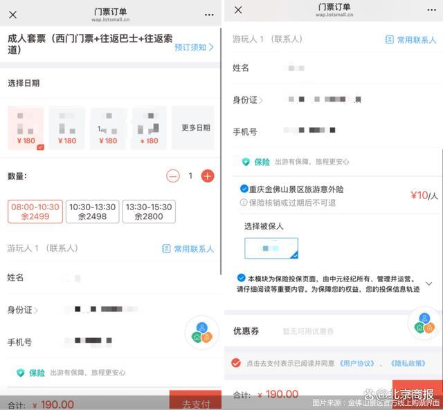 此外,出現(xiàn)“由中元經(jīng)紀所有、管理并運營”相關(guān)描述的還有重慶金佛山景區(qū)。在金佛山景區(qū)微信公眾號官方購票渠道中,點擊成人套票(西門門票+往返巴士+往返索道)這一選項后,顯示價格為180元。在提交訂單時,會默認勾選有“重慶金佛山景區(qū)旅游意外險”,價格為10元。該選項旁標有:“本模塊為保險投保頁面,由中元經(jīng)紀所有、管理并運營請仔細閱讀等重要內(nèi)容。”