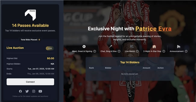 此外,活動(dòng)現(xiàn)場(chǎng)將見(jiàn)證 STAYNEX 與 Patrice Evra 的簽約儀式,并獲取精美禮品、幸運(yùn)抽獎(jiǎng)和獨(dú)家優(yōu)惠。具體相關(guān)權(quán)益或競(jìng)拍鏈接以及競(jìng)拍教程請(qǐng)查看STAYNEX.VIP 官方說(shuō)明。