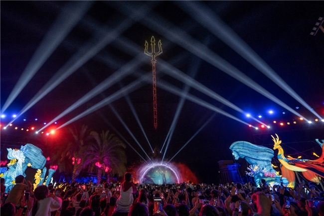 活動期間,每晚都會上演《深海狂歡》無人機(jī)水幕秀。視頻內(nèi)容通過人工智能建模技術(shù),實現(xiàn)了角色形象的高精度三維重建,構(gòu)建出具有高度真實感和動態(tài)表現(xiàn)力的虛擬角色。隨著劇情的推進(jìn),數(shù)百架無人機(jī)在夜空中變幻多種圖案,點(diǎn)亮海棠夜空,演繹出獨(dú)屬于亞特蘭蒂斯的海底狂歡。