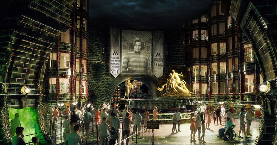 第二個矚目的新園區(qū)是哈利波特魔法世界(The Wizarding World of Harry Potter)的擴(kuò)建園區(qū):并命名為魔法部之謎(Ministry of Magic),項(xiàng)目首次跳出了一期園區(qū)霍格沃茨與對角巷,深入《神奇動物》系列中1920年代的巴黎魔法部。喬治卡爾森(George Carlson)設(shè)計(jì),英國全息視覺公司Holovis打造的 “魔法部時空電梯(Ministry Time-Turner Elevator)”將無縫穿梭紐約、倫敦與巴黎,采用4D投影實(shí)時渲染窗外街景,形成極具震撼力的沉浸式魔法場景體驗(yàn)。而 “默默然防御訓(xùn)練(Obscurial Escape)” 多人射擊游戲,需用魔杖擊退熱感應(yīng)投影的黑暗生物,積分實(shí)時影響勛章等級,將游客互動參與性帶入全新的高度。