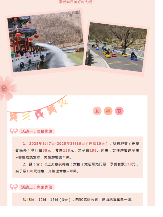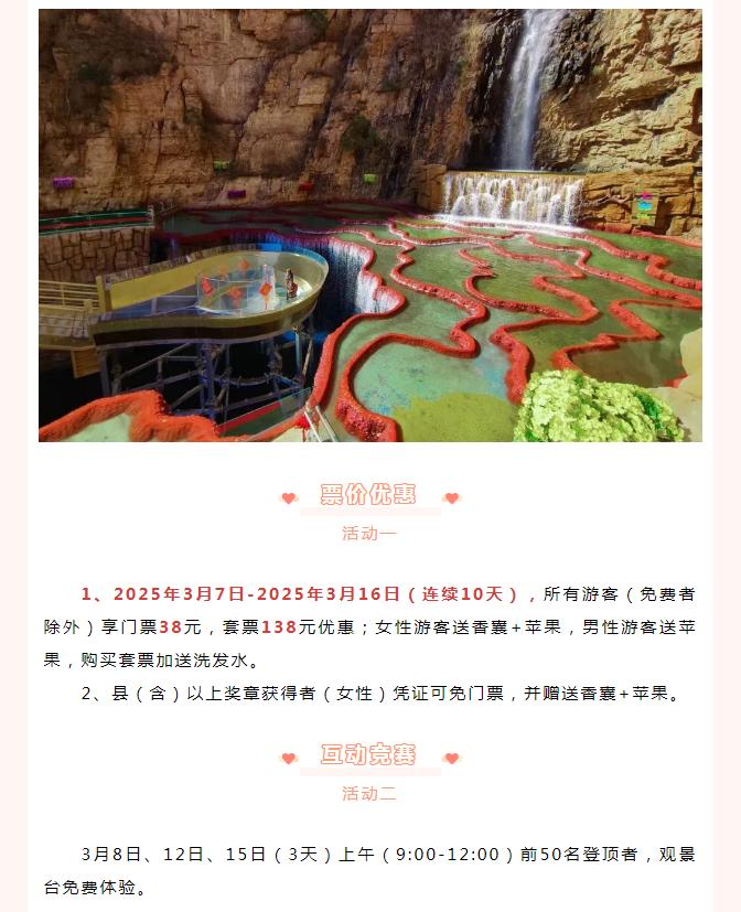 2025年3月8日-3月16日,女士免門票,男士門票半價(jià)(優(yōu)惠只限景區(qū)門票)