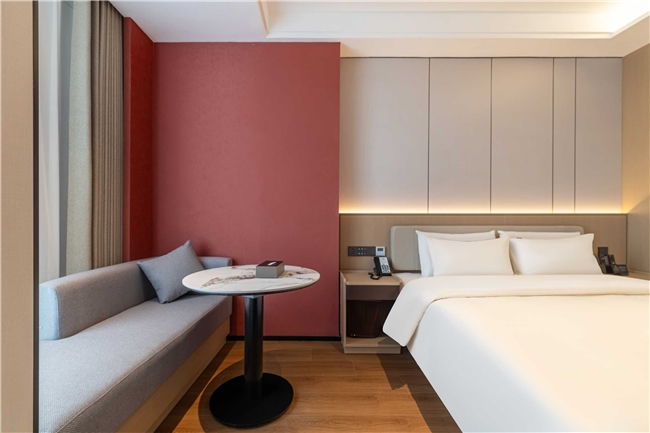 酒店共設(shè)125間豪華客房,涵蓋高級房、行政房、親子房及行政套房等多種房型。設(shè)計以“海棠紅”與“寶石紅”為主色調(diào),融合現(xiàn)代雅致與地域文化元素,營造淡泊素雅的藝術(shù)氛圍?头颗鋫渲悄苷Z音助手、智能門鎖、燈光控制系統(tǒng)等科技設(shè)施,打造沉浸式智慧旅居空間。公共區(qū)域還設(shè)有大堂吧、書吧、茶室、中餐廳、會議室、健身房、洗衣房等配套設(shè)施,滿足賓客的多元需求。