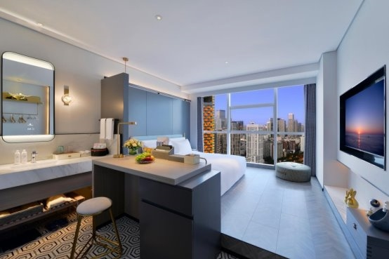 客房哲學:320間客房搭配全景落地窗設計,干濕分離設計搭配臨窗浴缸,申寶冷暖床墊實現(xiàn)“冬暖夏涼”智能溫控,高端雅蘭布草,細節(jié)處彰顯東方待客之道。