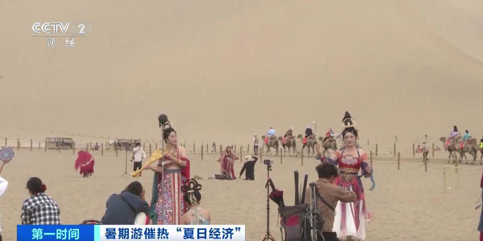 在鳴沙山月牙泉景區(qū),眾多游客身著飛天、金剛、西域公主等服飾,在沙丘間體驗(yàn)敦煌特色旅拍。