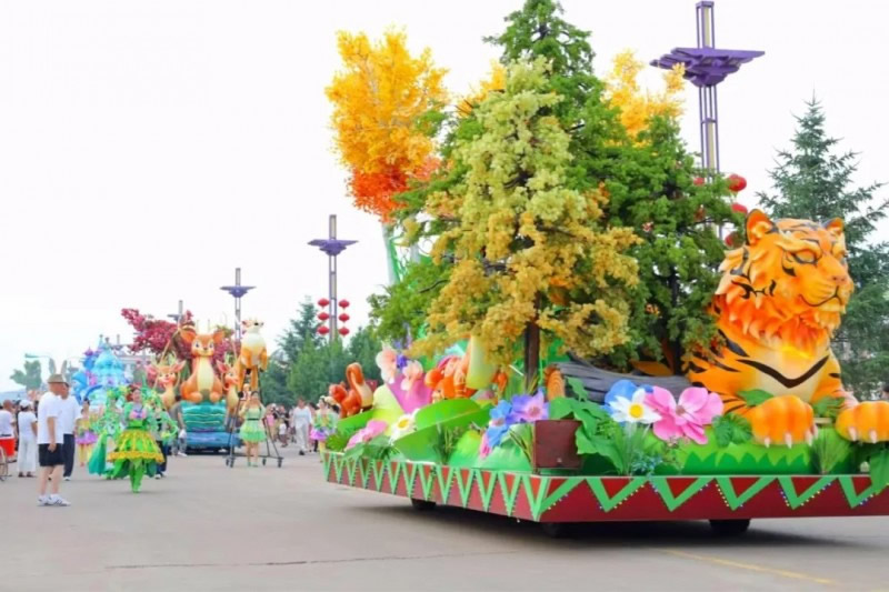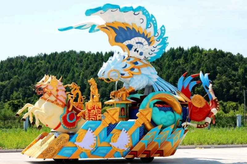 花車設(shè)計不僅注重視覺沖擊力,更融入動態(tài)特效:虎頭擺動、翅膀扇動、雪花機噴灑等細節(jié),讓靜態(tài)的造型煥發(fā)生命力。夜幕降臨時,花車更以夜光效果點亮林海,為觀眾呈現(xiàn)一場光影交織的奇幻盛宴。