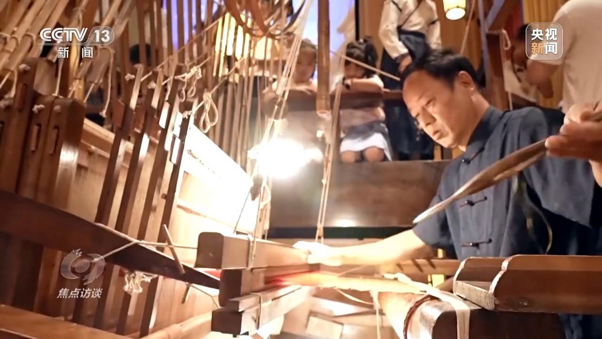 蜀錦省級(jí)非遺傳承人 曹代武:梭子從這個(gè)開(kāi)口里邊過(guò)來(lái),然后我就把緯線編織到里面了,織出來(lái)就是你現(xiàn)在看到的這個(gè)唐代的五彩鳥紋樣。再來(lái)一梭,一梭一梭的,就這樣反反復(fù)復(fù)。