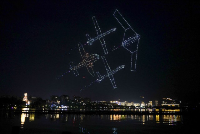 這是7月11日晚在重慶市梁平區(qū)雙桂湖國家濕地公園拍攝的無人機表演。新華社記者 黃偉 攝