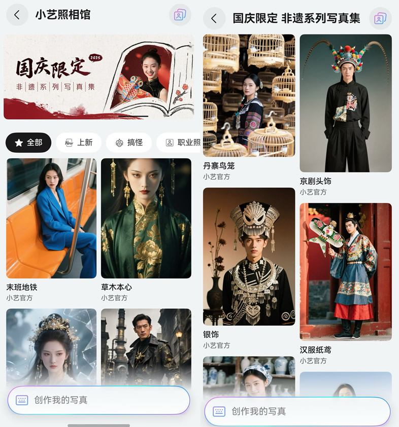 另外,對于想拍文化感滿滿的國風影像的用戶,小藝照相館Agent上線了國慶限定非遺系列模板,進入小藝App>右下角發(fā)現(xiàn)>智能體>小藝照相館后,在國慶限定專區(qū)選擇喜歡的模板,然后就可按步驟生成高質量的國風寫真,打造專屬非遺系列寫真紀念冊。