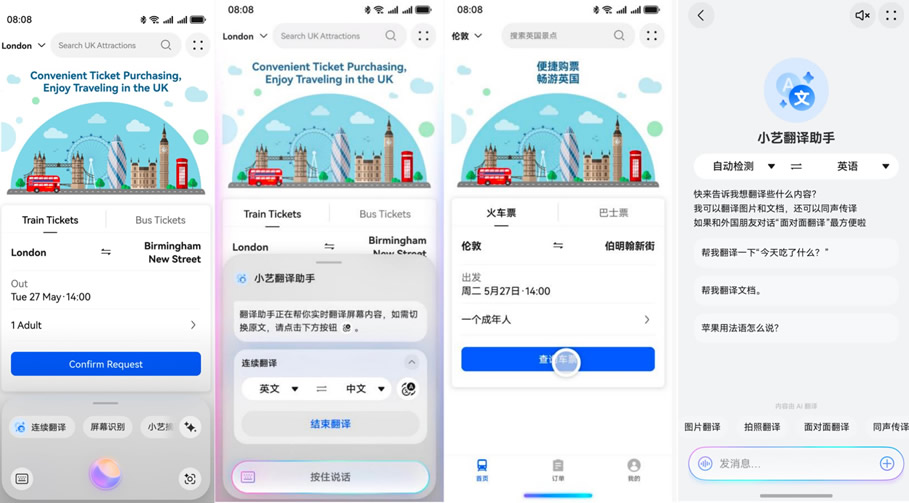 當然,小藝的能力遠不止于此。海外出行時,用戶翻閱外文網(wǎng)站或使用外文App,只需長按屏幕底部小藝導航條,點擊“連續(xù)翻譯”,或直接喚醒小藝后說“連續(xù)翻譯”,即可體驗邊瀏覽邊翻譯的效果。當需要與外國友人進行面對面溝通時,使用小藝的面對面翻譯幫你輕松應對跨語言溝通場景;遇見不認識的外文路牌、菜單,拍照發(fā)給小藝翻譯助手秒翻譯。