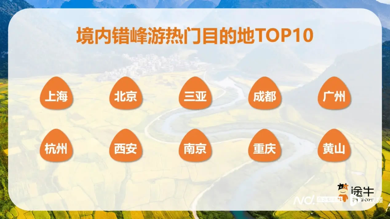 境內(nèi)錯(cuò)峰游仍是多數(shù)游客的首選,途牛平臺(tái)上境內(nèi)出游人次占比超過70%。熱門目的地包括上海、北京、三亞、成都、廣州、杭州、西安、南京、重慶、黃山等地。