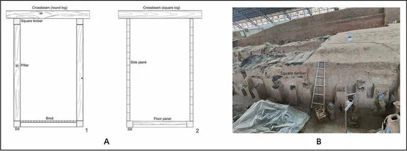 陪葬坑過洞主要木質框架結構示意圖(A1:兵馬俑坑;A2:K9901及K9801)及兵馬俑一號坑內炭化木質建筑結構。秦始皇帝陵博物院供圖