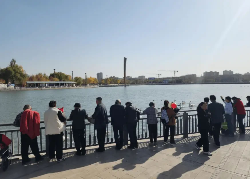 10月28日,在杜鵑河彭加木雕像水域附近,成群的天鵝和野鴨等鳥類在河面上游弋、嬉戲,潔白的天鵝與碧水、藍(lán)天、樓宇相映成趣,美輪美奐,吸引了不少市民和游客駐足欣賞,構(gòu)成一幅自然和諧的生動(dòng)畫卷。重慶游客張清揚(yáng)說:“第一次來到庫爾勒,看到美麗的天鵝,心情都被治愈了,這是大自然的饋贈(zèng),庫爾勒的自然環(huán)境好,才會(huì)吸引這么多天鵝來這里過冬。”