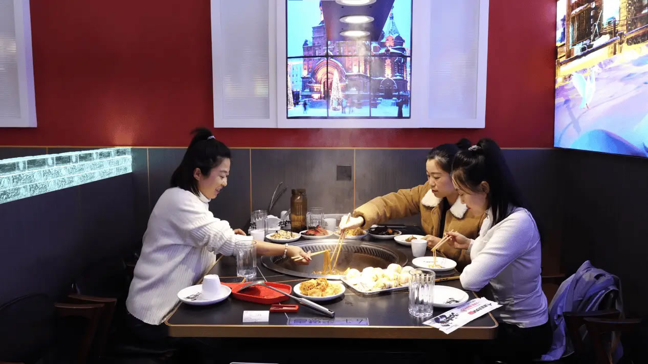 走進(jìn)同江市一家人氣很旺的鐵鍋燉餐館,濃郁的肉香混雜著酸菜的清爽撲面而來,鐵鍋里的大鵝與酸菜咕嘟作響,店內(nèi)十余張餐桌座無虛席,食客們的談笑聲與鐵鍋的燉煮聲交織成冬日里熱鬧的煙火氣。這是同江商家搶抓冰雪季商機推出特色優(yōu)惠套餐帶來的人氣。