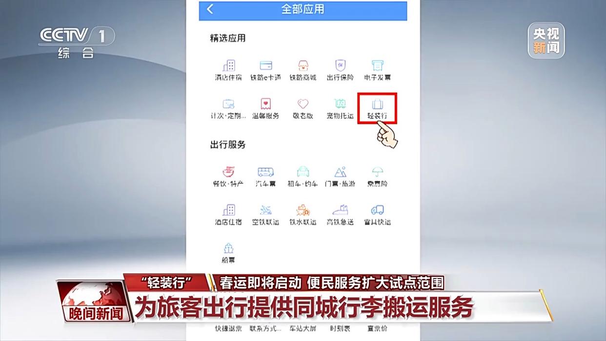 “輕裝行”是鐵路部門為旅客出行提供的“門到站”“站到門”同城行李搬運服務(wù)。已購車票的旅客只需打開鐵路12306App或微信小程序,在首頁中部應(yīng)用欄向左滑動,找到“全部應(yīng)用”,點擊進入即可找到“輕裝行”模塊,根據(jù)需求預(yù)約下單。