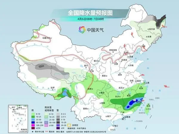 4月6日,內(nèi)蒙古東北部、東北地區(qū)中北部、西藏東北部和西北部、青海南部等地部分地區(qū)有小雪或雨夾雪,其中,黑龍江東北部、青海南部等地部分地區(qū)有中到大雪,黑龍江東北部等地局地暴雪。西藏東南部、江南中南部和廣東東北部等地部分地區(qū)有中到大雨,其中,江西南部、福建西部和北部等地部分地區(qū)有暴雨。
