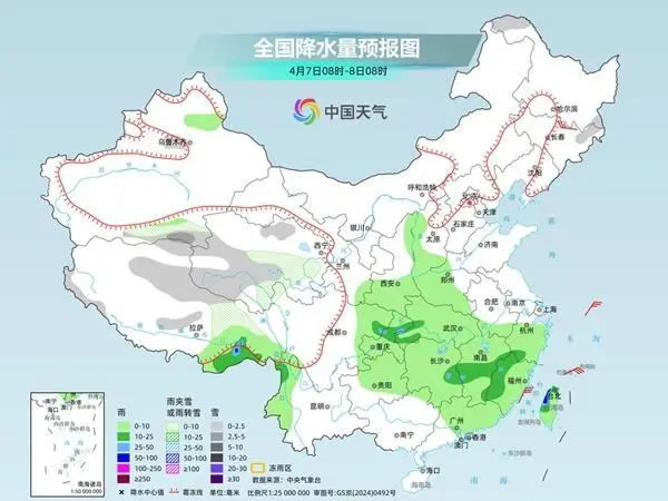 4月7日,西藏北部、青海中南部等地部分地區(qū)有小雪或雨夾雪。西藏東南部、四川盆地東北部、重慶中部、湖北西南部、湖南東部、江西中部、浙江南部、福建西部、臺(tái)灣島等地部分地區(qū)有中到大雨,其中,臺(tái)灣島西北部等地部分地區(qū)有暴雨。