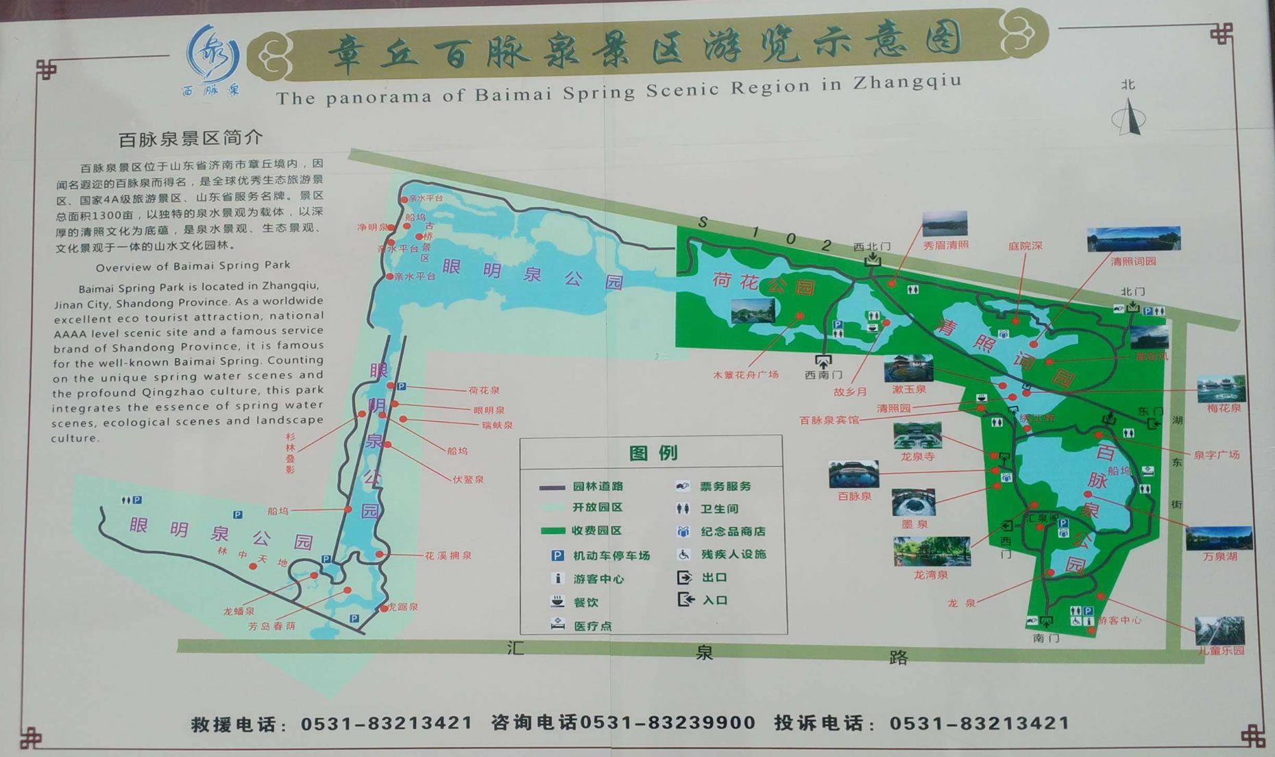 公園布局由著名園林專家孫筱祥先生設(shè)計(jì),園名由已故著名書(shū)法大師舒同題寫(xiě)。園內(nèi)噴泉5處,石拱橋3座,石土假山2座,石、木板平橋、各一架。并建有匯泉閣、湖心亭、船塢碼頭等。公園景點(diǎn)布局因地緣勢(shì),順?biāo)飨,逐次展開(kāi),設(shè)計(jì)獨(dú)特,構(gòu)思巧妙。全園分為泉水、花園、幽靜學(xué)習(xí)、林蔭散步、兒童樂(lè)園5個(gè)區(qū)。泉水區(qū):奇花異草,千姿百態(tài)、鳥(niǎo)語(yǔ)花香,競(jìng)相斗艷。幽靜學(xué)習(xí)區(qū):環(huán)境幽雅,空氣清新,掩卷吟歌,浮想聯(lián)翩。密林散步區(qū):小橋流水,蜿蜒曲折,灌木叢生,暗柳成蔭。兒童樂(lè)園區(qū):游龍戲水,木馬滑梯,蕩秋千,跳蹦蹦床,高架橋,星空穿梭游藝機(jī),樂(lè)不思?xì)w。公園內(nèi)樓、臺(tái)、亭、榭、閣,點(diǎn)綴其間,錯(cuò)落有致,相互輝映。假山、密林、湖水、斷橋,別有洞天,可謂“疑是山窮水無(wú)路,柳暗花明又一景”。濟(jì)南七十二名泉中的百脈泉乃園中勝景,公園也因之得名。1997年5月,又在園西北隅建成清照罷工(李清照紀(jì)念館),公園風(fēng)光無(wú)限,更添春色。百脈泉公園是鑲嵌在章丘大地上的一顆明珠。百脈泉公園,位于山東省濟(jì)南市章丘區(qū)明水境內(nèi),這里是龍山文化的發(fā)祥地,一代詞宗李清照的故里。