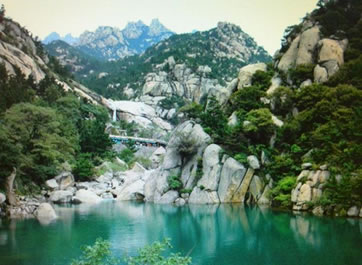 嶗山八水河中游,于百尺懸崖飛流直下,噴珠吐玉,狀如龍舞,故名“龍?zhí)镀佟。潭中碧水凝寒,清澈?jiàn)底。山雨過(guò)后,洪涌瀑注,飛騰叫嘯,蔚為壯觀。