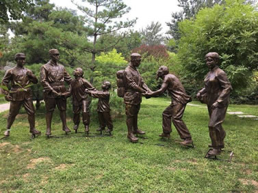 勝利大道全面反映抗戰(zhàn)時期八路軍戰(zhàn)士英勇抗敵,與日軍斗智斗勇,最終取得勝利的畫面。畫面包括:地道戰(zhàn)、地雷戰(zhàn)、小兵張嘎、雞毛信、鐵道游擊隊、雁翎隊、狼牙山五壯士、白求恩、聶耳(義勇軍進行曲)、黨的兒女、歡慶勝利、支援前線、雙槍李向陽、百團大戰(zhàn)、送子參軍、消息樹、紅燈記等21 組雕塑。