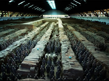 兵馬俑坑位于秦始皇帝陵東側1.5公里處西楊村南,是秦始皇帝陵的陪葬坑。已發(fā)現(xiàn)三座,分別編為一、二、三號兵馬俑坑。三座俑坑占地面積達2萬多平方米,內有和真人、真馬大小相似的陶俑、陶馬近8000件。有車兵、騎兵和步兵等不同的兵種,排列整齊有序。