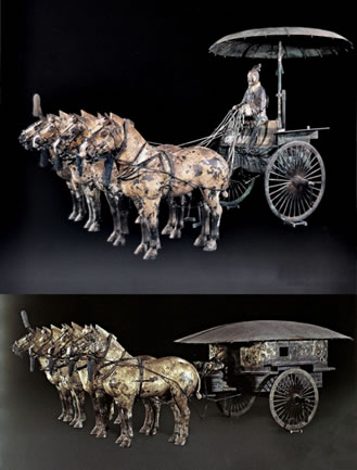 銅車馬是秦始皇的陪葬品之一,象征著秦始皇鑾駕的一部分。銅車馬的形制是模仿實實在在真車的形狀。以前考古發(fā)現(xiàn)的車都是木質的,出土時已腐朽,銅車馬的出土使今人能夠清楚地看到古代御用車駕的真實面貌。銅車馬是按秦始皇御用車隊中屬車二分之一的比例縮小制成的,車蓋以及車輿內外彩繪著精美的紋樣;兩乘銅車馬上的金銀飾品重達14公斤,顯示了銅車馬高貴的等級。