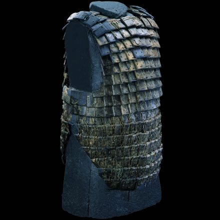 此展品為秦代的石器,通長64.00厘米,出土于秦始皇帝陵K9801陪葬坑。鎧甲由前、后身甲和一對披膊組成,共有甲片380片。鎧甲的開合口位于右側肩、胸的交接處。