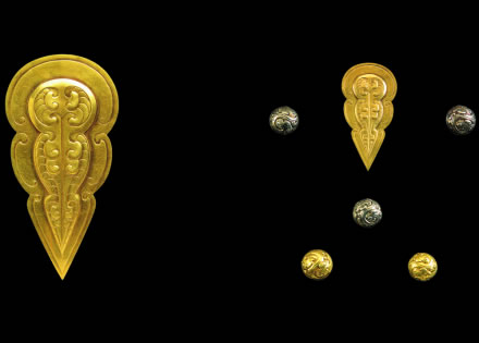 此展品為秦代的金器,金當盧是秦始皇陵銅馬車馬頭部飾物。正面有細線勾畫出流云紋,中部有兩條蟠虺紋組成蟬狀紋樣,紋樣凸起呈淺浮雕形。當盧背面印刻“十二”,鈕上有“上”銘文。