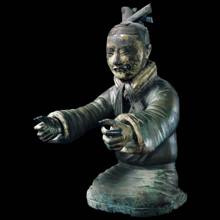 此展品為秦代的陶器,通高51.00厘米,重51.92千克,出土于秦始皇帝陵西側銅車馬陪葬坑,為秦陵二號銅馬車上的御官俑。御手通體彩繪,頭戴鹖冠,身穿長襦,腰束革帶,下穿長褲,與秦俑坑出土的高級軍吏俑相似,也是具有一定爵位的軍吏。 |
