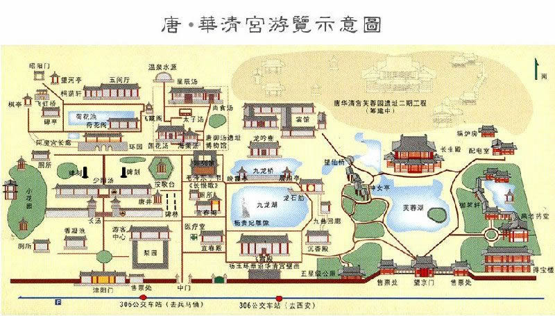 從文獻記載和野外的實際考察中,大抵可知華清宮的范圍是:南至驪山西繡嶺第一峰(即周烽火臺),北到今縣城北什字。東至石甕谷(寺溝)。西到鐵路療養(yǎng)院西側的牡丹溝。宮城(即羅城),南至山根,北到今縣城南什字,東至東窯村,西到游泳池。1967年新華書店在南什字西北角修建營業(yè)樓,發(fā)現(xiàn)了用青石砌成的宮城北墻的墻基。1981年春,城建單位在西街丁字形路北,也發(fā)現(xiàn)了同樣的北墻基。1982年冬于寺溝村南的山坡上探出東繚墻兩段。從調查和發(fā)掘所見遺跡及文獻資料所記,華清宮的建筑布局嚴謹,曲折縈回,規(guī)模宏大。唐玄宗以民脂民膏,建此豪華宮苑,供一己之歡娛,然曾幾何時,“漁陽鼙鼓”驚破了他的美夢。華清宮樓殿湯池,遂漸次破壞,自宋以至明清,其原有建筑已蕩然無存。記其遺跡,乃以彰我民族之文化,并以此為借鑒,建立一個新時代的風景旅游區(qū),供廣大人民群眾游覽。唐代華清宮充分利用了有利地形,使其成為一座結構嚴謹、富麗堂皇的龐大宮殿建筑群。主要殿舍以溫泉為中心,構成華清宮的核心。然后向山上和山下展開,利用地形特點,布設不同類型和用途的樓閣亭榭,同時還有青松翠柏、荔枝園、芙蓉園、梨園、椒園、東花園等分布其間,把整個華清宮妝扮得格外妖嬈。華清宮的建筑依山面水,鱗次櫛比,除宮城(羅城)外,還有繚墻環(huán)繞?潐χ,又羅列不少建筑,清乾隆《臨潼縣志》稱:“湯井殊名,殿閣異制,園林洞壑之美,殆非人境”。