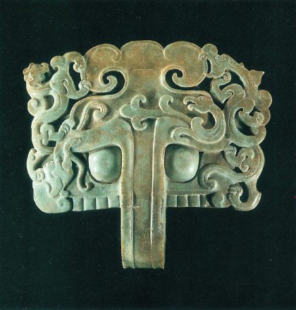 橫寬36.5厘米,灰綠色,下有凸鈕,四角略弧圓,分別碾琢其時流行的青龍、白虎、朱雀、玄武四神像。器物下方以環(huán)鈕為鼻梁,上連粗眉和暴起雙眼,形成大獸面,下緣則以8條豎紋勾勒出寬大的排牙。圖案化的形象莊嚴凝重,工藝精美,線條運用剛?cè)嵯酀?