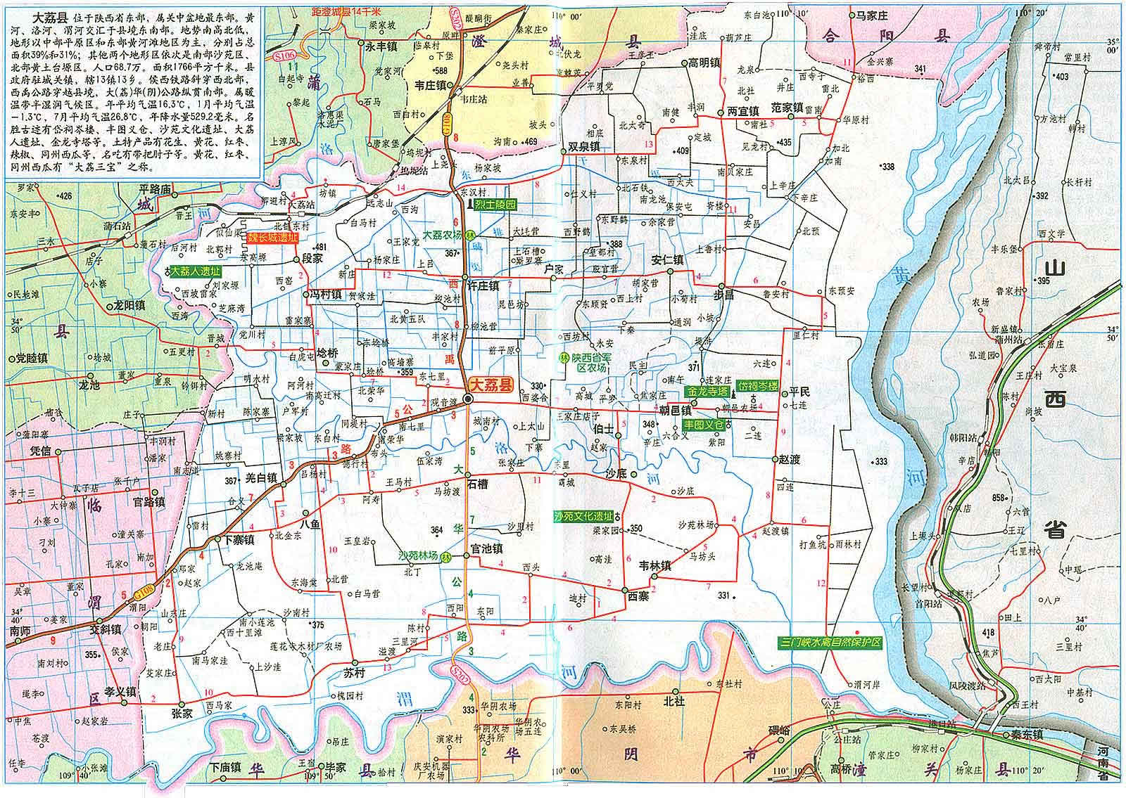 大荔縣位于關(guān)中平原東部,是黃 、洛、渭三河匯流之地。南界渭河與潼關(guān)、華陰、華縣為鄰,西繞洛河與蒲城、臨渭區(qū)毗連,北沿臺(tái)塬與澄城、合陽(yáng)縣接壤,東瀕黃河與山西永濟(jì)相望,素有"三秦通衢"、"三輔重鎮(zhèn)"之稱(chēng)。大荔縣總面積為1776.1平方公里,全縣轄7鎮(zhèn)26鄉(xiāng),414個(gè)行政村。總?cè)丝?2萬(wàn)人。