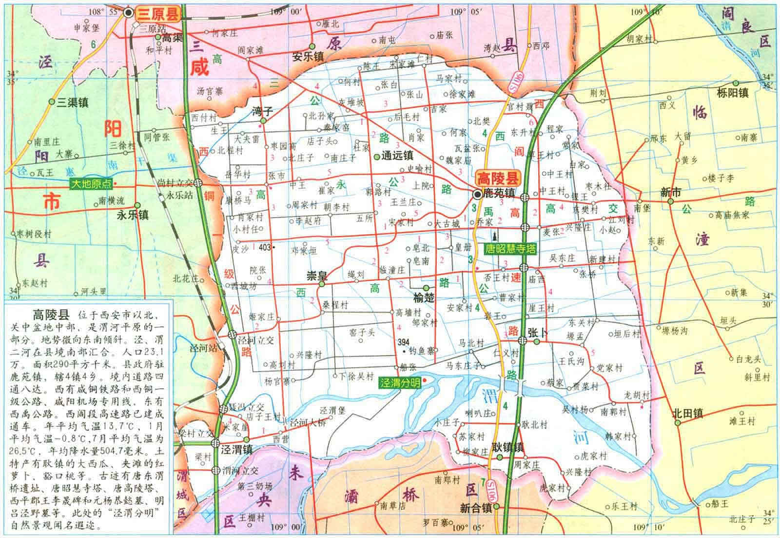 高陵縣地勢平坦,土壤肥沃,人稱關(guān)中的“白菜心”。東靠臨潼區(qū),南接未央、灞橋區(qū),西連咸陽渭城區(qū)、三原縣、涇陽縣,北臨閻良區(qū),屬西安市近郊縣,距西安市中心僅20公里,距咸陽國際機場10公里。涇渭二水橫貫東西,西禹、西銅高速公路、210國道及西延鐵路橫貫?zāi)媳保瑳芎踊疖囌疚挥谄渲小?ldquo;五區(qū)、二水、四線”已緊密地把高陵縣與西安市融為一體。