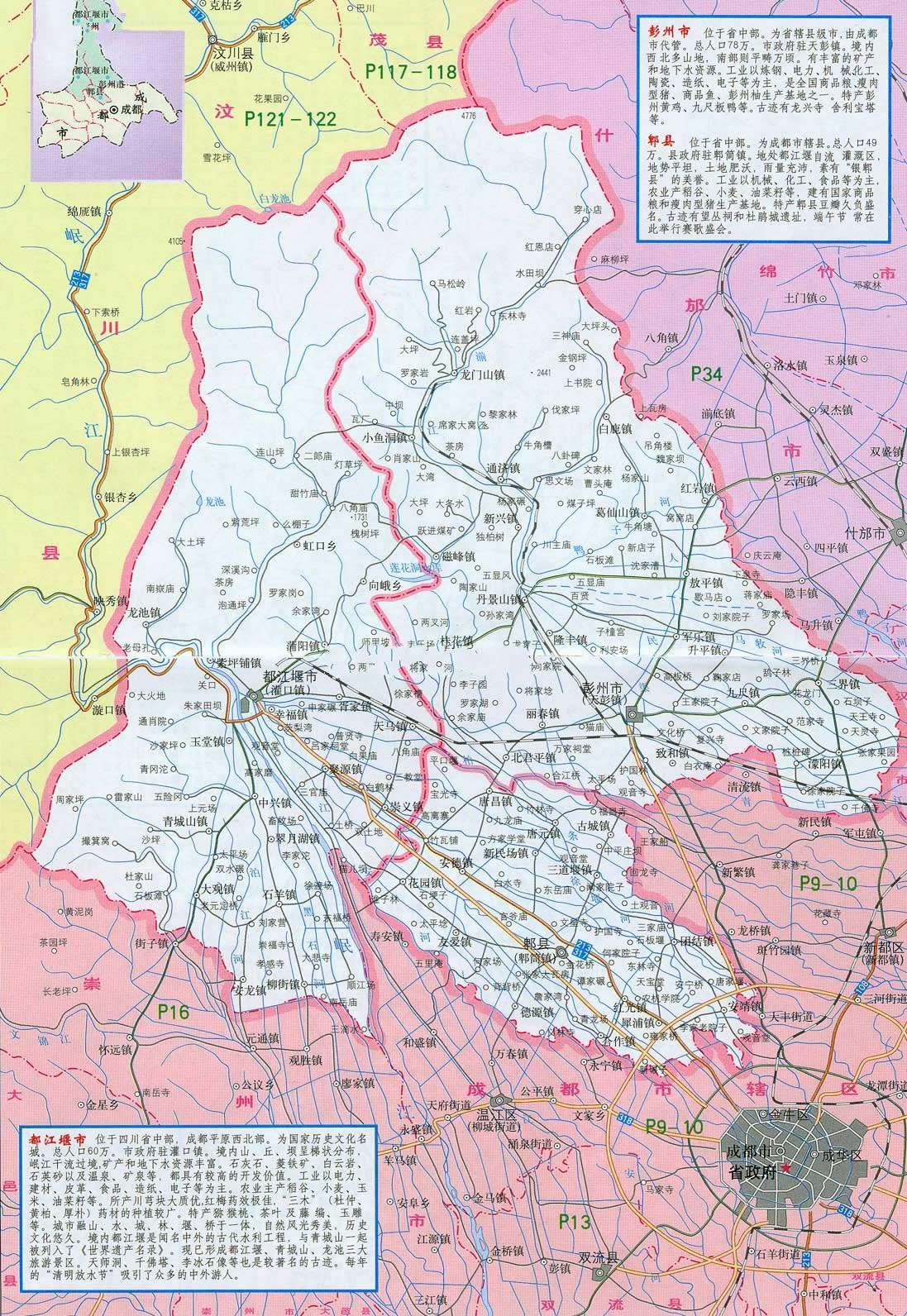 彭州市位于四川省會成都西北部,距成都市區(qū)25公里,人口78萬,面積1420平方公里,是成都市人口第三,面積第二的小康市。彭州是古蜀國建都立業(yè)的核心地區(qū),自秦漢以來,建縣設(shè)郡達(dá)2000多年,有著悠久的歷史文明,素有“天府金盆”、“蜀漢名區(qū)”之美譽(yù)。