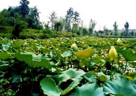 潭內(nèi)種植有許多觀賞荷花,初夏時節(jié),碧荷連天、綠滿大地、蓮花朵朵,香飄滿園。輕風(fēng)吹過,花兒嬌羞欲語、隨風(fēng)起舞、揺曵生姿,為這寧靜的湖光山色憑添了許多的生機(jī)和靈氣。由此讓我們不禁想到周敦頤的《愛蓮說》:“蓮,花之君子者也!薄俺鲇倌喽蝗荆鍧i而不妖,中通外直,不蔓不枝,香遠(yuǎn)益清,亭亭靜植,可遠(yuǎn)觀而不可褻玩焉!