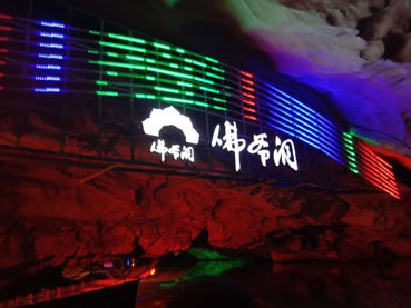 由南天門(mén)往右,沿著崎嶇的“盤(pán)陀路”進(jìn)入第二殿,隨著“一柱廳”、“半天山”到達(dá)約有450平方米寬的“東海龍宮”那里“定海神針”直立,“五彩神泉池”水色清澈晶瑩,不寒而栗有“白龍?jiān)浇瓓Z寶”、“頑猴望”、“海獅戲蓮”、“別甲神鷹鎮(zhèn)金沙”、“龍王百寶箱”等天然造型,氣勢(shì)磅礴,極為壯觀。龍宮內(nèi)洞中有洞、景中有景!拔淞陥@”有牛角尖、簸箕天,海螺洞中有“鶴蚌相爭(zhēng)”、“海螺觀戰(zhàn)”、“鳴鑼助戰(zhàn)”、“石床”等石筍、鐘乳石造型,相映成趣,目不暇接。然而,“山有洞天不算奇,陰河劃船數(shù)第一”。沿著灣灣曲曲的跳蹬路,耳聽(tīng)潺水聲,觀看“地海橫鯨”、“青蛙駝蓮”、“天地桃”、“美猴照鏡”等景點(diǎn)來(lái)到陰河劃船處——“凱旋門(mén)”、只見(jiàn)幽幽碧水,微泛漣漪,各種燈光倒映水中的燈景冉冉浮動(dòng)。