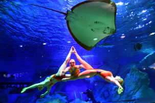 徜徉于多彩的海底世界,一覽多彩珊瑚、熱帶魚(yú)群以及兇猛的鯊魚(yú)構(gòu)成的海底世界。美麗的俄羅斯水秀演員、童話(huà)里的美人魚(yú),搖曳身姿,共同舞動(dòng)海底深處的視覺(jué)奇跡。探訪深海的馴養(yǎng)師也將攜手兇猛鯊魚(yú),演繹人鯊共舞。