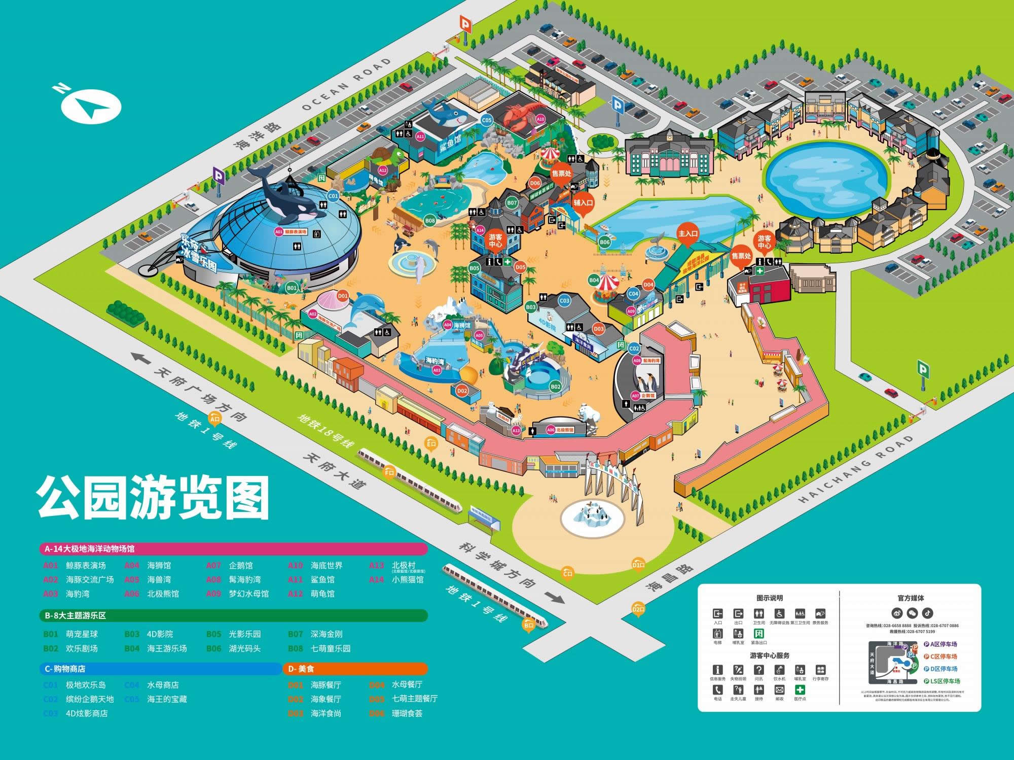 作為承載科普、互動(dòng)、歡樂(lè)、體驗(yàn)為一體,戶(hù)外游樂(lè)區(qū)+室內(nèi)動(dòng)物場(chǎng)館+大型演藝場(chǎng)結(jié)合的海洋主題公園,成都海昌極地海洋公園擁有鯨豚(白鯨、海豚)、北極熊、企鵝、海豹、海獅、萌龜、水母、北極狐、北極狼、小熊貓 [4] 等14大海洋動(dòng)物場(chǎng)館,以及海王游樂(lè)場(chǎng)(器械游樂(lè)設(shè)備)、萌寵星球(水陸空動(dòng)物互動(dòng)區(qū))、光影樂(lè)園、4D影院、深海金剛科技體驗(yàn)館、七萌童樂(lè)園(夏季為親水玩水區(qū))等8大主題游樂(lè)區(qū)。游客入園,還能欣賞到《鯨豚聯(lián)盟》、《人鯊共舞》、《海獅運(yùn)動(dòng)會(huì)》等海洋科普秀,夏日還有快樂(lè)無(wú)比的國(guó)際花車(chē)巡游和戲水狂歡限時(shí)上演。