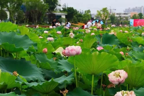 工程實行24小時全天作業(yè)。經(jīng)過緊張有序的施工建設(shè),荷花種植面積共約619畝。計劃種植荷花約20萬株,荷花育苗工作已全面完成,絕大部分已長出嫩芽,成活率達99.9%。此外,涉水基礎(chǔ)項目水下主體已基本完工,光彩亮化項目預(yù)計6月底基本完工,市政、綠化項目的重要節(jié)點部分在7月底亮相。預(yù)計8月初向市民開放。