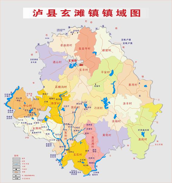 瀘縣玄灘鎮(zhèn)鎮(zhèn)域圖 行政區(qū)劃 瀘縣玄灘鎮(zhèn)幅員面積115平方公里,轄區(qū)內人口9萬人,城鎮(zhèn)建成區(qū)面積2平方公里,常住人口2.2萬人。轄5個社區(qū)、20個行政村《正大街社區(qū)、東街社區(qū)、西街社區(qū)、中和社區(qū)、喻坪社區(qū) 》、《石鵝溝村、金龍寺村老油房村、通山村、石鵝溝村、玄豐村、新屋村、平安村、刁河村、黃坭村、涂場村、龍鳳村、涂豐村、易灣村 、太陽村、中心村、海羅村、玉石村、黃泥灘村、勞動村、朱和村》! 歷史沿革 1934年設玄灘鎮(zhèn),1937年改鄉(xiāng),1951年復建鎮(zhèn),1958年改公社,1992年再復鎮(zhèn)。1997年,面積74平方千米,人口5.6萬,轄龍鳳、飛躍、永紅、涂鋒、刁河、馮光、黃泥、同豐、黃林、新山、平安、光前、紅星、向灣、易灣、斷石龍、新屋、蔣灣、金龍寺、新房子、玄鋒、高場、陳家咀、石鵝溝、通山、萬居所、桑壩、東風、宋糟坊、瓦子壩、清油坊31個行政村和正大街、馬路街、半邊街、鹽聯街4個居委會。 2004年,面積78平方千米,轄31個村、4個社區(qū),總人口57621人。集鎮(zhèn)建成區(qū)面積1.7平方千米,常住人口2.15萬人。 2006年,將原玉河鎮(zhèn)所屬行政區(qū)域并入玄灘鎮(zhèn)。玄灘鎮(zhèn)政府駐玄灘場。