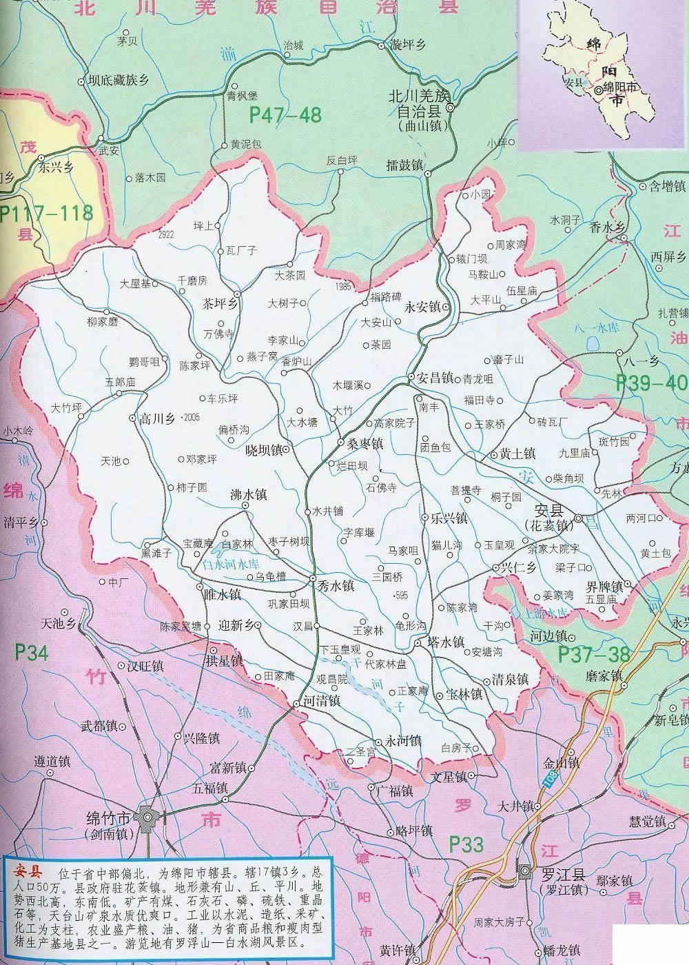 安縣位于四川盆地西北部,距成都110公里,距綿陽科技城10公里?h境山丘壩兼有,幅員1404平方公里。總?cè)丝?0萬人,轄4鄉(xiāng)16鎮(zhèn)。安縣氣候宜人,生態(tài)環(huán)境優(yōu)美。屬亞熱帶濕潤季風(fēng)氣候,氣候溫和,雨量充沛,四季分明,日照充足,無霜期長。年均氣溫16.3℃,年均降水量1260mm,空氣質(zhì)量常年達(dá)國家二級標(biāo)準(zhǔn),森林覆蓋率達(dá)42%?h內(nèi)交通四通八達(dá),人流、物流進(jìn)出快捷方便 ,現(xiàn)代通訊覆蓋全縣,并開通了ADSL業(yè)務(wù)和高速寬帶網(wǎng)絡(luò),光纖有線電視遍布城鄉(xiāng)。自然資源豐富,有水泥石灰石、磷礦、煤、硫鐵礦、重晶石、鋁土礦等礦產(chǎn)資源29種,儲量豐富;有動物資源948種,其中大熊貓、金絲猴等國家一、二級保護(hù)動物77種;有植物資源814種,其中銀杏、珙桐等國家一級珍稀植物及棗皮、杜仲、烏藥等中藥材資源100多種。工業(yè)基礎(chǔ)良好。電子、建材輕化、能源、化工、食品等支柱工業(yè)日益壯大。農(nóng)業(yè)生產(chǎn)條件優(yōu)越,農(nóng)村經(jīng)濟(jì)持續(xù)發(fā)展。雜交水稻制種、優(yōu)質(zhì)水稻、無公害蔬菜、水果、無規(guī)定疫病畜禽養(yǎng)殖、水產(chǎn)、蠶桑、魔芋、棗皮等農(nóng)業(yè)產(chǎn)業(yè)化經(jīng)營蓬勃發(fā)展。