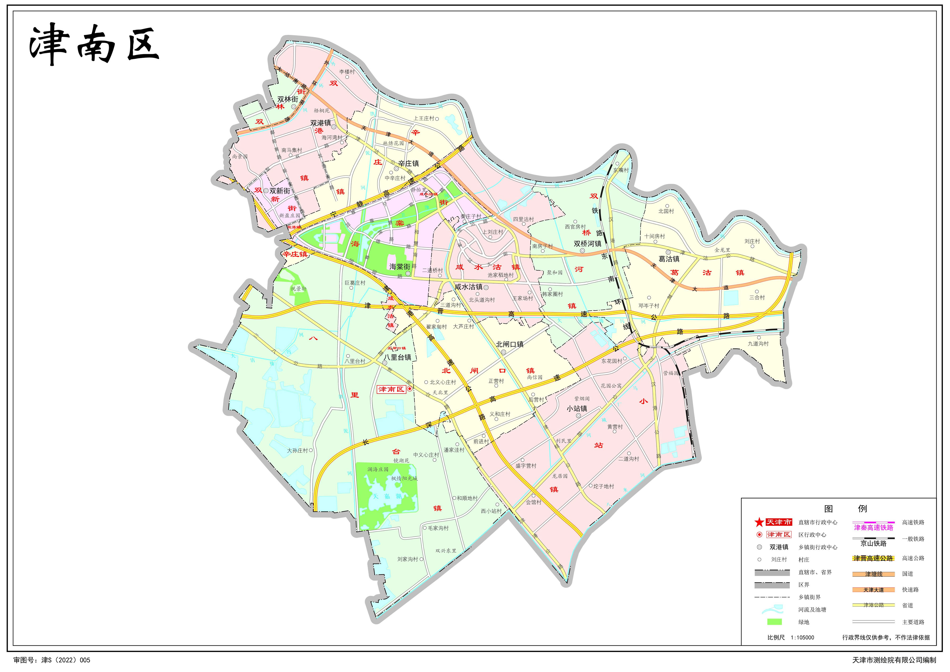 鎮(zhèn):咸水沽鎮(zhèn)、葛沽鎮(zhèn)、小站鎮(zhèn)、雙港鎮(zhèn)、辛莊鎮(zhèn)、雙橋河鎮(zhèn)、八里臺鎮(zhèn)、北閘口鎮(zhèn)