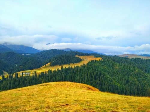 夏季,在每年的6、7月份是避暑消夏的季節(jié)。初到這里的人,會錯覺以為到了瑞士:沒膝的黨生花、貝母花和一種叫不上名的小黃花漫山遍野,就像神仙種植的一樣,在草地里自然生長為好幾層。爭奇斗妍,沁人心脾的花香令人陶醉;遠(yuǎn)處群山起伏,層巒疊嶂,連綿不斷,蒼松翠柏直插云霄,雪峰、林海和綠草鮮花構(gòu)成了一副秀麗的山水畫卷;行走在這綠茸茸、濕漉漉的草地上,涼風(fēng)習(xí)習(xí),盡情呼吸新鮮的空氣和花草的芳香,一種心靈被大自然凈化的感覺油然而生。再往里面走就是雪山,皚皚的積雪終年不化。騎馬可以到達雪山腳下,那里溫度急劇下降,剛才還是短褲T恤,就得穿上厚棉衣。身上還是烈日曬著,頭頂一朵云飄過,很可能就是一陣瓢潑大雨,讓你看著太陽卻渾身濕透。過一會雨停了,山風(fēng)已不知不覺吹干了你的衣服。