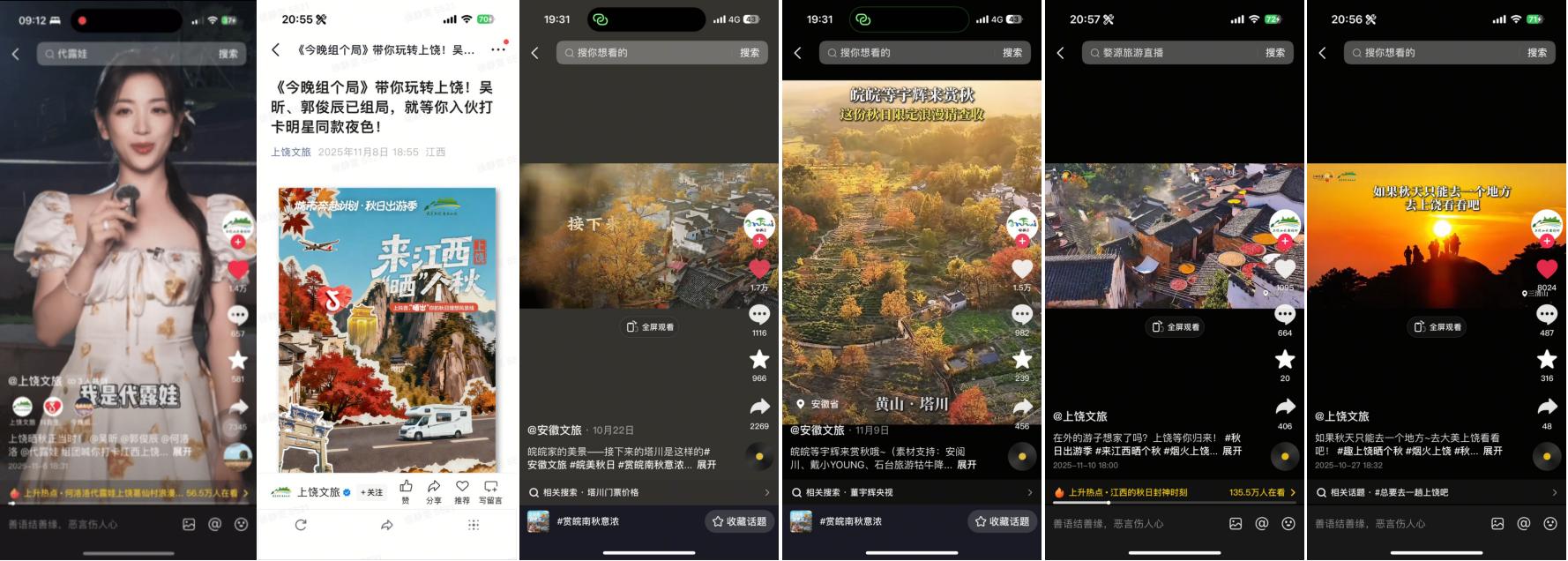 50余位跨界及垂類(lèi)達(dá)人共同參與秋季種草內(nèi)容創(chuàng)作,整體曝光量突破千萬(wàn)級(jí)別,覆蓋江西上饒、安徽黃山15家重點(diǎn)頭部商家,以多元化的內(nèi)容視角與持續(xù)的內(nèi)容輸出,形成從點(diǎn)到面的內(nèi)容爆發(fā)態(tài)勢(shì),推動(dòng)江西#婺源曬秋的味道藏不住了 、安徽#潛入徽州的秋日畫(huà)卷 等城市賞秋熱點(diǎn)上榜,讓江西與安徽兩地秋景,以更生動(dòng)的方式呈現(xiàn)在用戶(hù)面前。