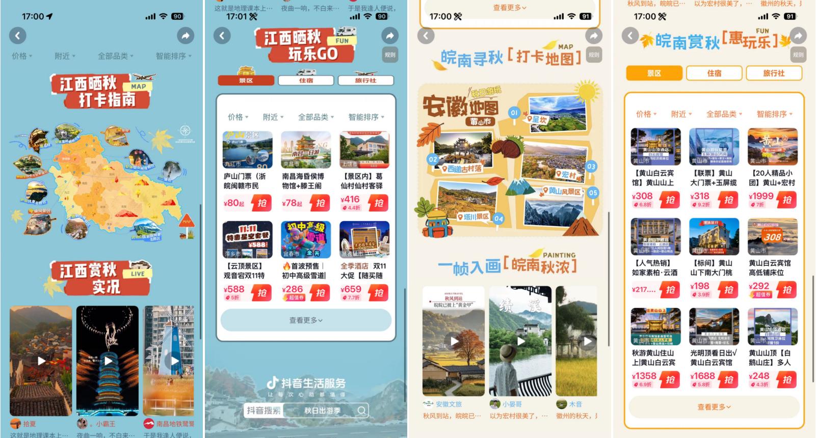 抖音深度響應(yīng)用戶(hù)對(duì)季節(jié)限定體驗(yàn)的需求,以“秋日儀式感”為切入點(diǎn),聯(lián)動(dòng)江西和安徽多城自然人文類(lèi)商家,分別發(fā)起#來(lái)江西曬個(gè)秋 與#賞皖南秋意濃 話(huà)題活動(dòng),累計(jì)收獲話(huà)題總播放量2945萬(wàn),用戶(hù)投稿4275條,相關(guān)搜索UV突破406萬(wàn),同比增長(zhǎng)19%。從江西婺源的篁嶺景區(qū)到安徽黃山的三塔景區(qū),從葛仙村的千燈夜游到三清山的云海勝景,抖音平臺(tái)的內(nèi)容生態(tài)與交易場(chǎng)景實(shí)現(xiàn)深度融合,推動(dòng)江西與安徽兩地文旅目的地整體支付達(dá)GMV2.22億元,同比增長(zhǎng)246%,讓從發(fā)現(xiàn)出行靈感至完成目的地消費(fèi)的全過(guò)程更加順暢自然。