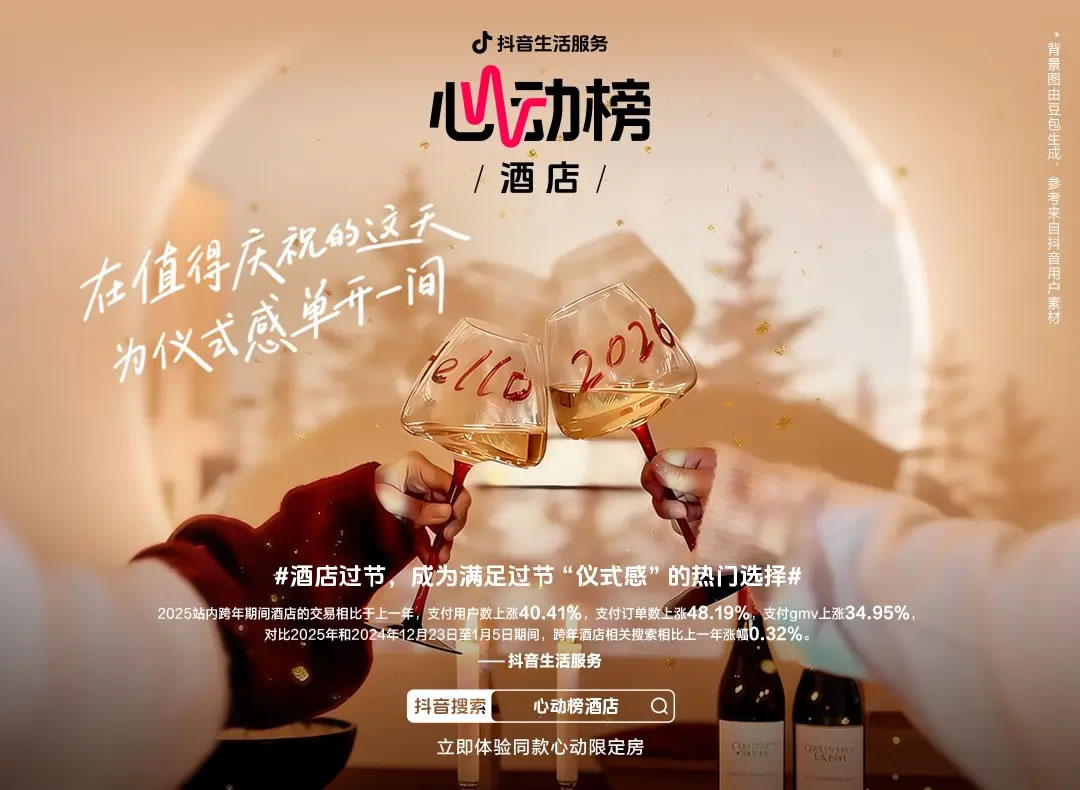在這場全民性儀式感浪潮中,抖音生活服務(wù)推出的「心動榜酒店」之跨年航班和紅人派對,精準(zhǔn)切入并引爆了市場熱度,數(shù)據(jù)顯示,圍繞此類活動的內(nèi)容播放量和參與度屢創(chuàng)新高。酒旅行業(yè)的競爭邏輯,正在從傳統(tǒng)的“目的地與價格”之爭,全面升級為 “場景營造與情緒共鳴”, 抖音正試圖重塑高端酒店的消費(fèi)體驗(yàn),并重新定義節(jié)假旅行的消費(fèi)決策路徑。