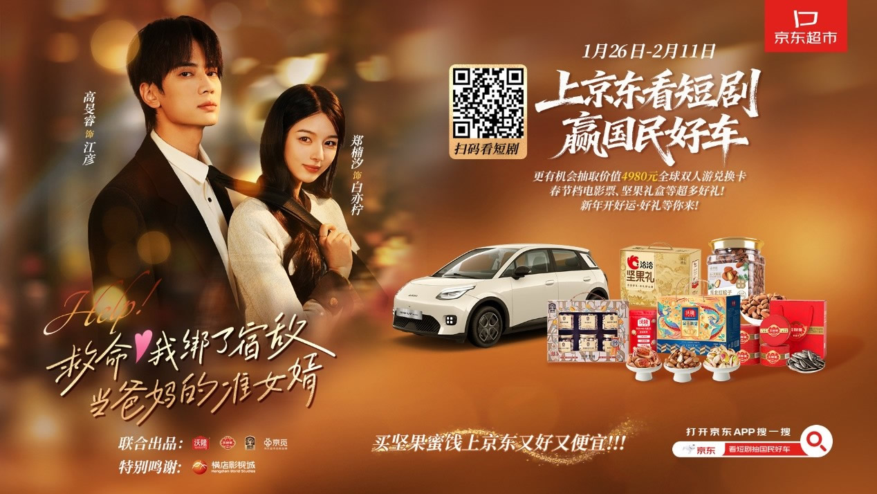 其中,京東旅行順應(yīng)當(dāng)下短劇熱門趨勢(shì),與京東超市堅(jiān)果蜜餞品類攜手創(chuàng)新內(nèi)容營(yíng)銷合作模式,聯(lián)合橫店影視城和沃隆、三胖蛋、臻味、京覓等堅(jiān)果品牌,聚焦春節(jié)團(tuán)圓、父母催婚等節(jié)點(diǎn)話題打造的定制輕喜微短劇,在呈現(xiàn)闔家歡樂的劇情中,自然融入京東堅(jiān)果品類心智,并聯(lián)合站內(nèi)看短劇贏國(guó)民好車的互動(dòng)活動(dòng),為品類品牌的年貨節(jié)營(yíng)銷打開新的思路,實(shí)現(xiàn)曝光-心智-引流-轉(zhuǎn)化的營(yíng)銷閉環(huán)。