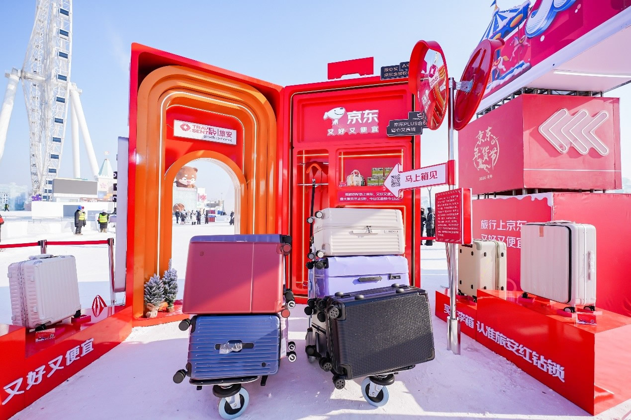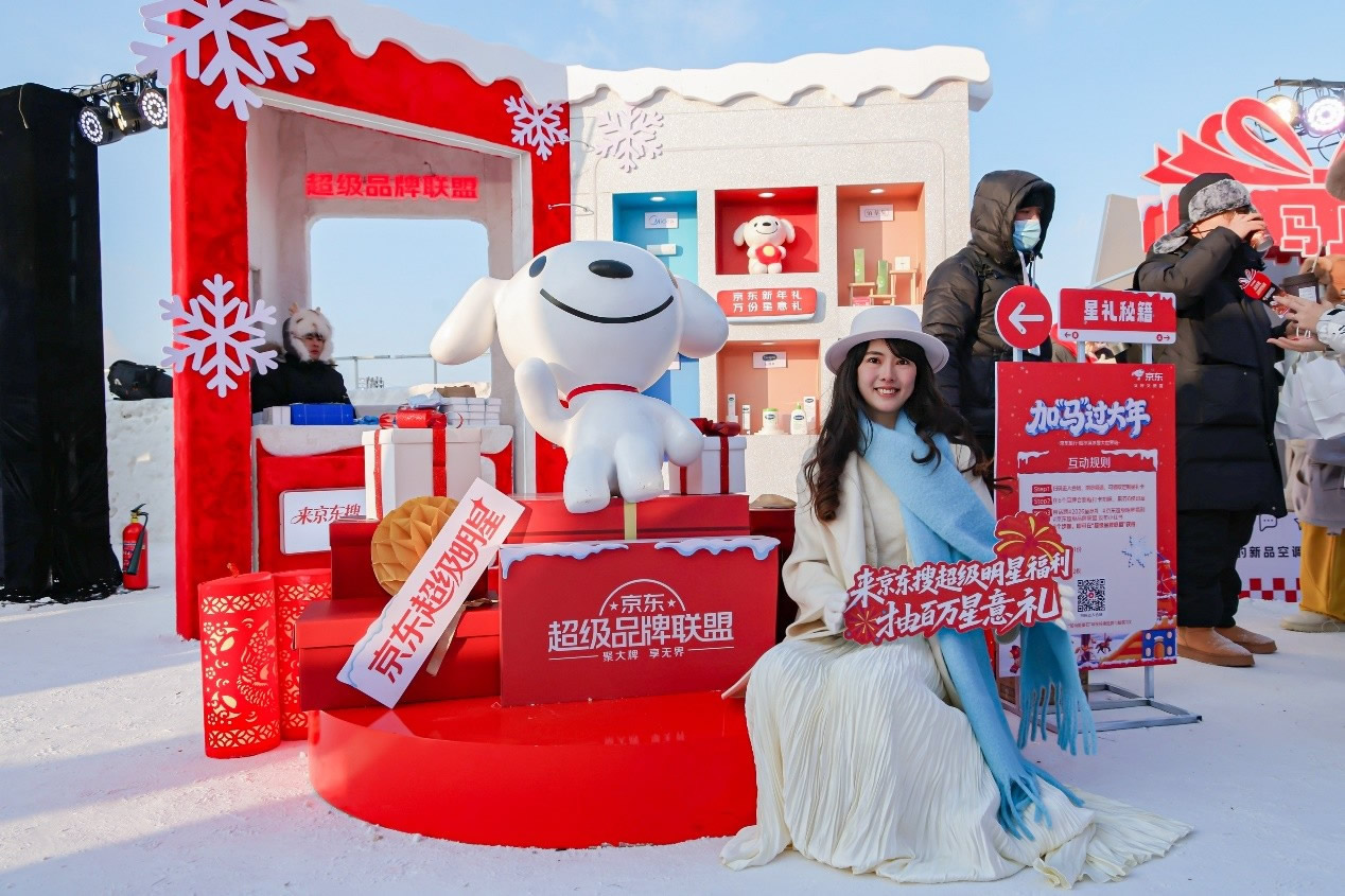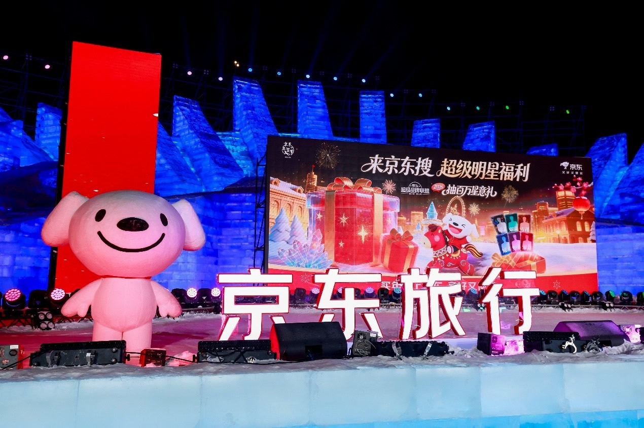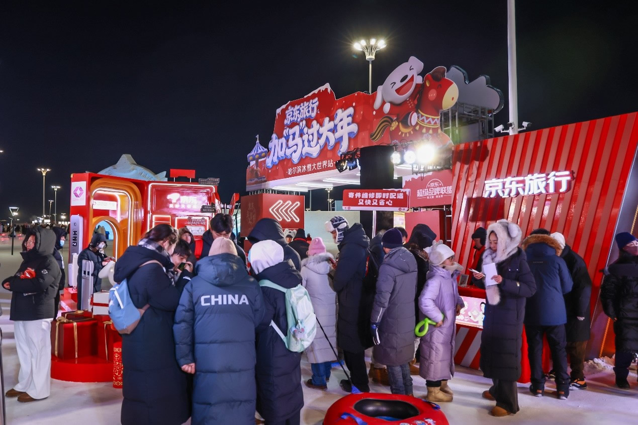 京東旅行在此次年貨節(jié)中深度融合兩大頂流文旅場(chǎng)景,實(shí)現(xiàn)線下事件與品牌傳播的雙重引爆。在哈爾濱冰雪大世界,京東旅行攜手京東箱包、京東健康、超級(jí)品牌聯(lián)盟、旅安、歐舒丹等品類品牌,依托其冬季頂流景區(qū)的話題熱度,通過多維互動(dòng)營(yíng)銷方式打造沉浸式跨界體驗(yàn):不僅設(shè)置“冰雪年貨快閃活動(dòng)”開展品牌展示與互動(dòng)游戲,更通過地標(biāo)冰雪摩天輪、無人機(jī)表演、冰雪大舞臺(tái)廣告/立體字/主持人口播、區(qū)域植入品牌立體廣告等豐富營(yíng)銷形式,共同實(shí)現(xiàn)品牌與景區(qū)流量的深度共振。