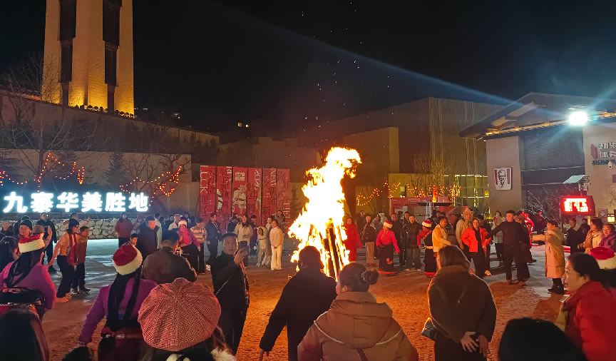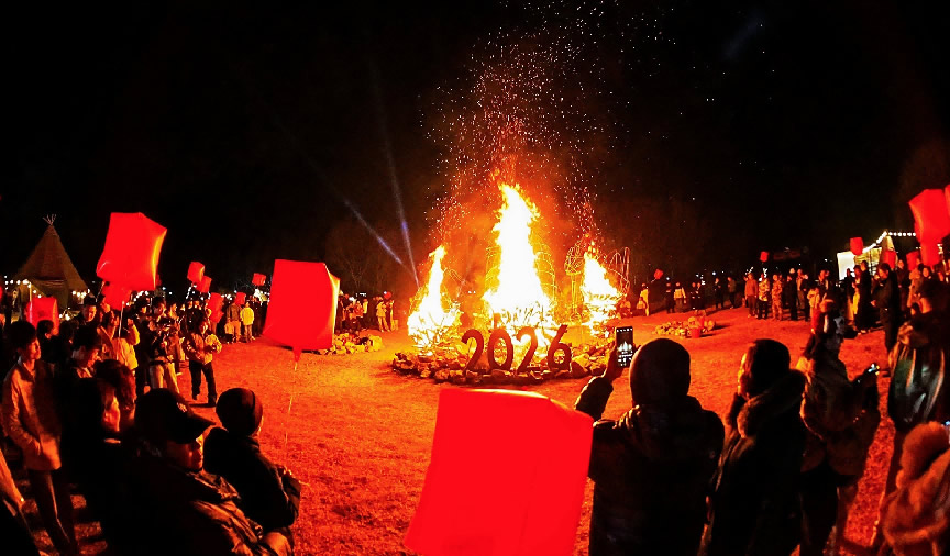 在京南華美勝地,游客們歡聚一堂,點(diǎn)燃跨年篝火,慶祝新年到來(lái)。