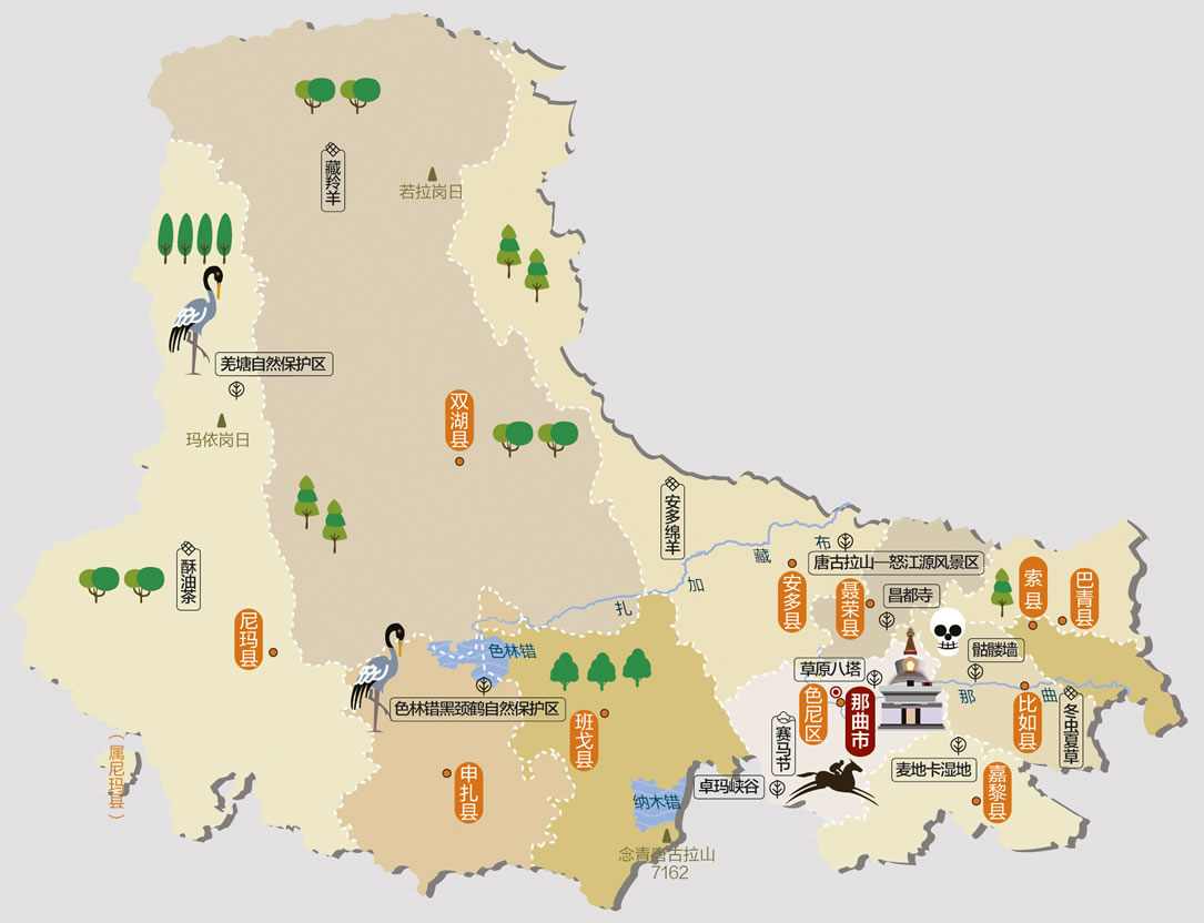 尼瑪縣 面積72530平方千米,人口33006,政府駐尼瑪鎮(zhèn),下轄1個鎮(zhèn)、13個鄉(xiāng)
