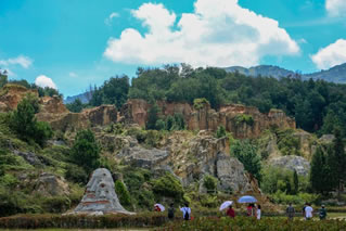 沙林采用《易經(jīng)》原理興建的門庭,以及全國最大的《爨史》浮雕,還有中央電視臺拍攝《三國演義》留下的孟獲寨門、王府等,頗具觀賞價值。彩色沙林附近,還有全國著名的爨龍顏碑,以及世界古地地理標(biāo)志“牛頭山古陸”及“玄帝公”寺,五峰山國家原始森林等景觀。